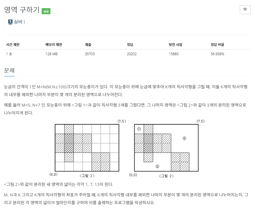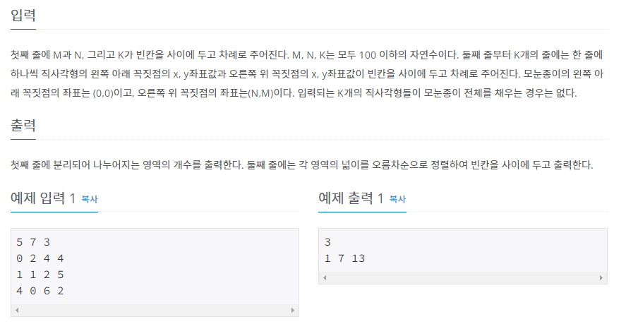 - ex) 테스트케이스에서 예시를 들어보면, 좌표값 (4,0), (6 2)를 뒤집어 (0,4),(2,6)를 만들고, 이는 배열 arr[0][4]에서 arr[1][5]까지 색칠되었다고 표현할 수 있다.