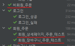 주문 로직의 큰 틀은 바뀐건 없지만 도메인 모델 패턴을 이용했을 때 코드의 흐름이 나름 명확해지고, 이해하기가 수월해졌다고 생각한다. 사실 위의 코드를 리팩터링한 것은 빙산의 일각에 불과하다. 잘 설계된 도메인 모델 패턴을 위해서는 프로젝트 설계시에 객체의 역할을 명확히 판별하고, 관계를 알맞게 정립해야 하기 때문에 굉장히 까다롭다고 한다. 이번 기회를 계기로 도메인 주도 설계에 대해서 더 배우고 싶다는 생각을 했고, 실제 프로젝트에 적용하기 위해서 노력할 것이다. 끝으로 미리 작성된 테스트 코드로 테스트한 결과 모두 파란불이 켜졌당.