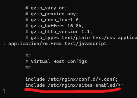 nginx.conf를 내리다보면, 다음과 같이 /etc/nginx/sites-enabled/* 가 있다. sites-enabled폴더 하위의 모든 파일을 include하기 때문에 저 경로를 따라가서 확인한다.