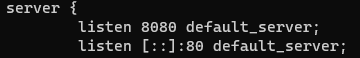 상단에는 위와 같이 listen 80 default_server가 보인다. listen은 http요청을 받을 포트를 설정하는 부분인데, 우리는 사전에 내부포트 8080을 사용한다고 했으므로(docker run -dit -p 80:8080 --name mycontainer ubuntu:20.04) 8080으로 바꿔준다. 두번째 줄의 listen은 IPv6 설정이므로 무시해도 된다.