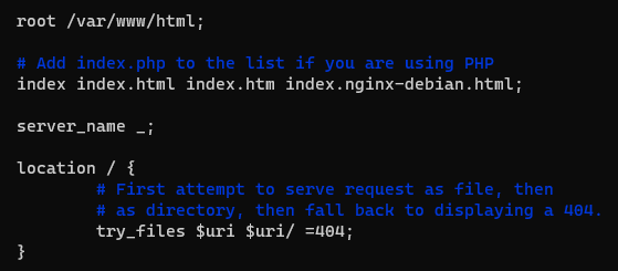 하단의 location에는 웹서버 주소에 따라 어디서 파일을 줄 것인지에 대한 경로를 명시한다. nginx는 디폴트로 http 요청 url이 "/"로 온다면 root /var/www/html 경로에 있는 index파일을 응답한다. location에 대한 자세한 사항은 다음 포스팅 예제에서 살펴보도록 하겠다.