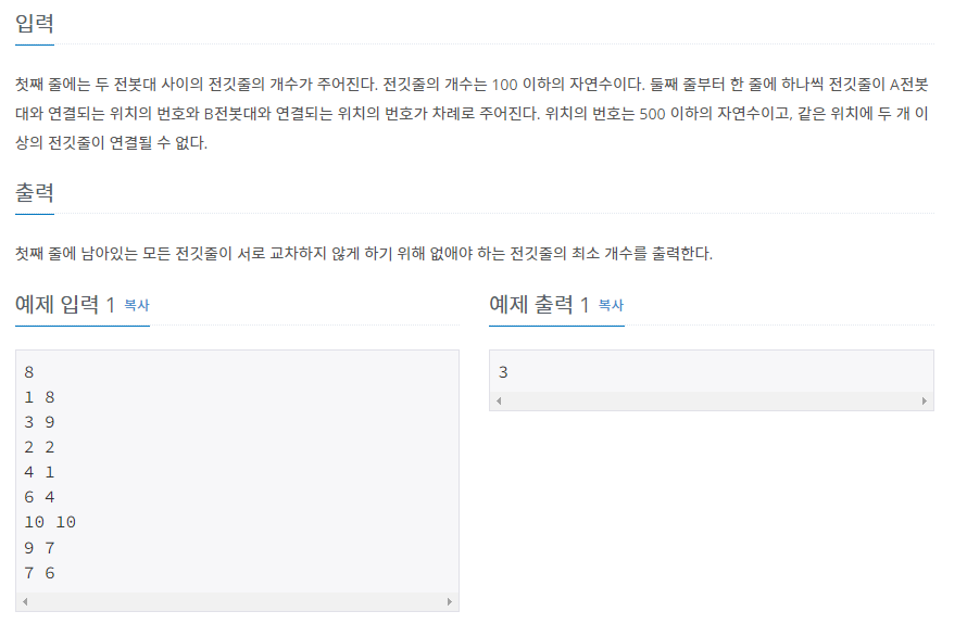 - 문제에서 없애야 하는 전깃줄의 최소 갯수를 구하라는 말은, 전깃줄의 전체 갯수 - 엉키지 않도록 하는 전깃줄의 최대 갯수를 구하라는 말과 동일하다.