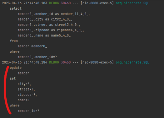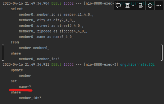 더티 체킹을 통해 자동으로 생성된 update쿼리는 기본적으로 모든 필드를 업데이트한다. 위에 보다시피 name만을 변경했지만, 실제로 쿼리는 city, street, zipcode, name 모두 업데이트 하는 걸 볼 수 있다.