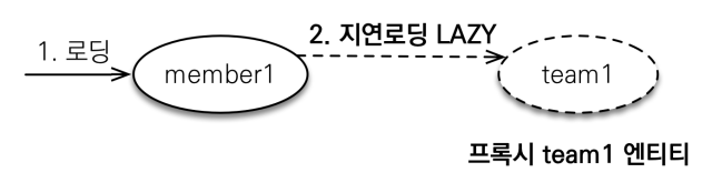 아래 그림과 같이 em.find로 member를 조회하면, Team엔티티를 프록시(가짜) 객체로만 불러오고, team.getName(); 시점에 프록시 초기화가 되어 DB로부터 값을 가져온다.