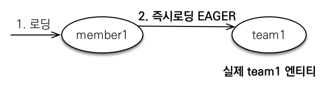 회원 엔티티를 조회할 때 연관된 팀 엔티티도 함께 데이터베이스에서 조회하는 것이 좋을까? 아니면 회원 엔티티만 조회해 두고 팀 엔티티는 실제 사용하는 시점에 데이터베이스에서 조회하는 것이 좋을까? 상황에 따라 다를 수 있기 때문에 정답은 없다. 연관된 엔티티를 조회하는 시점에 따라 2가지 방법이 있다.