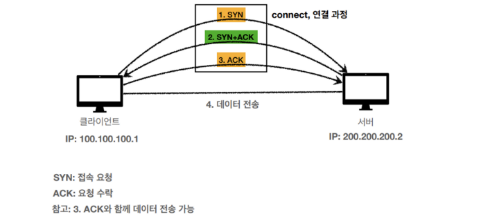 - 클라이언트가 SYN(연결 요청)을 보내고, 서버는 SYN과 ACK(수락)을 보낸다. 마지막으로 클라이언트가 ACK을 보내면서 이루어진다. (서버가 꺼져있다면 응답이 없을 것이다.)