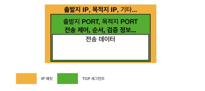전송 계층에서 TCP패킷이 인터넷 계층을 지나면서 IP패킷에 감싸지는데, 이를 자세히 살펴보면 다음 그림과 같다.