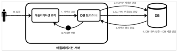 - DB드라이버는 DB와 TCP/IP 커넥션을 연결한다. 이 과정에서 3 way handshake 같은 네트워크 동작이 발생한다.