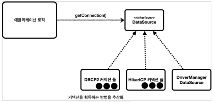 - 자바는 DataSource를 통해 커넥션을 획득하는 방법을 추상화했다. 이제 애플리케이션 로직은 DataSource 인터페이스에만 의존하면 된다.