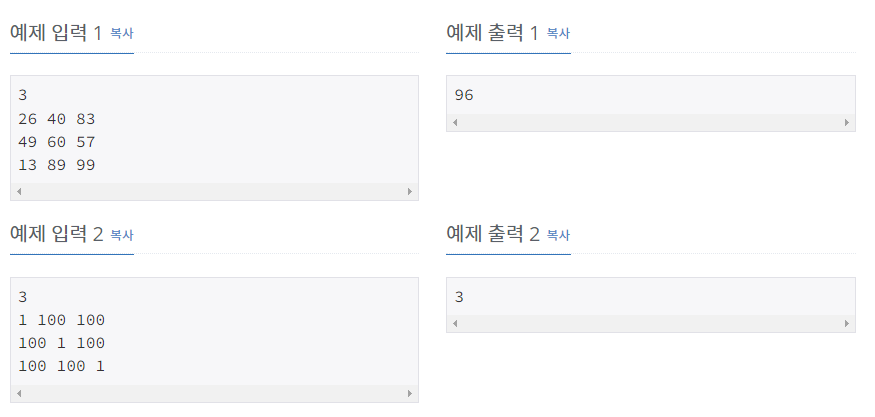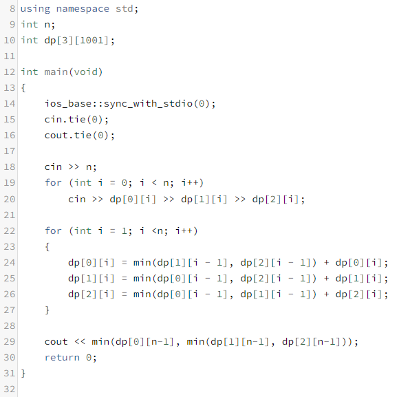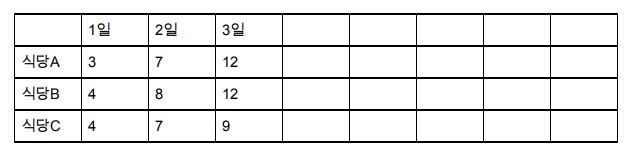 이런식으로 8일째 세 식당에서 밥을 먹은 경우 중 누적비용이 가장 적은 것이 정답이 된다.