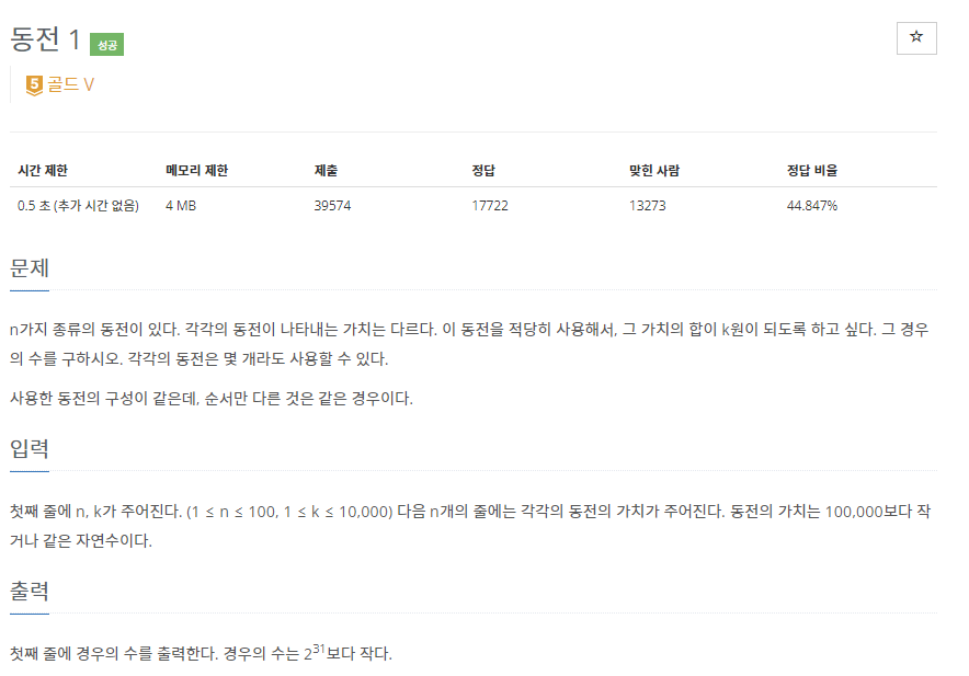 동전1문제는 다이나믹 알고리즘을 사용한다.