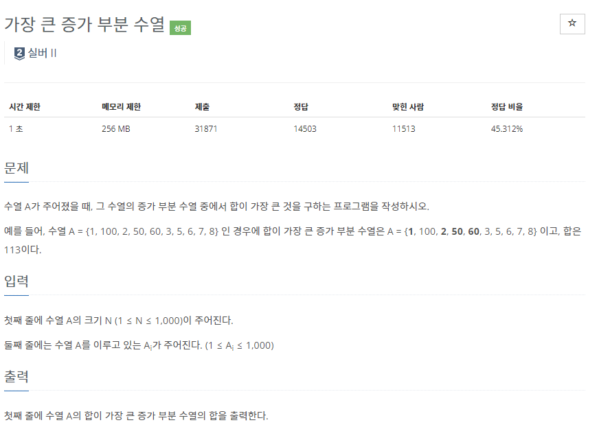 가장 큰 증가 부분수열을 찾을 때에는 합을 구해가면서 찾는다.