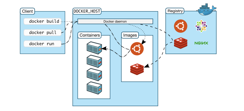 도커는 기본적으로 클라이언트-서버 아키텍처이다. 도커 클라이언트와 데몬은 소켓이나 Restful API를 통해서 통신한다. 자세한 내부구조는 도커, 컨테이너와 이미지가 무엇인지 알아보고 그림을 보면서 이해하자.