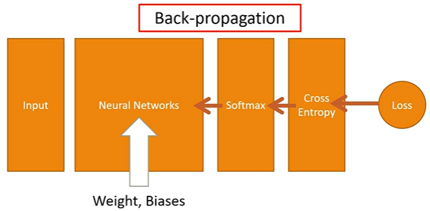 Feed-Forward의 결과로 얻은 Loss function은 결국 w와 b의 함수로 이루어졌기 때문에 출력부분부터 시작해서 입력쪽으로(역방향으로) 순차적으로 loss function에 대한 편미분을 구하고, 얻은 편미분 값을 이용해서 w와 b의 값을 갱신시킨다.