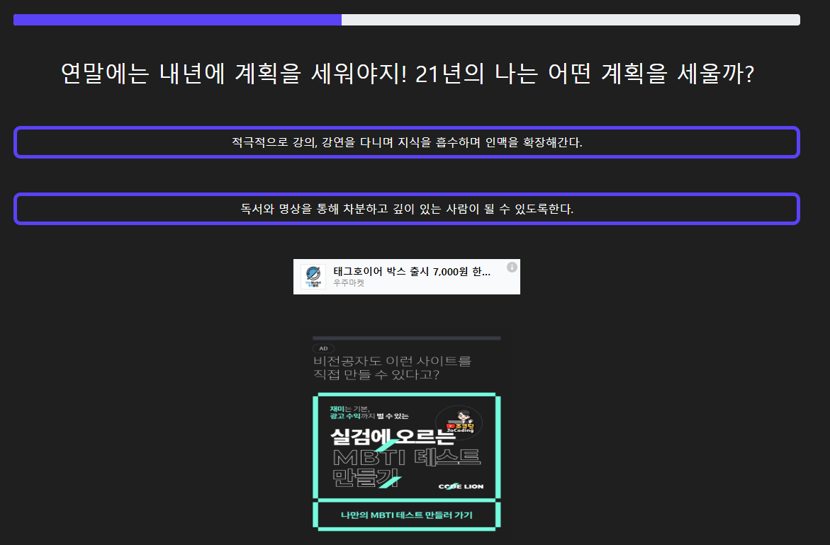 [문제화면]으로 넘어가면 답변1과 답변2로 나누어서 답변 1을 선택했을 시에, E/I or S/N or T/F or J/P 를 결정하는지에 대한 type에 따라 만약에 검사자가 E에 해당하는 답변을 눌렀을 경우에 hidden value를 ++ 해주는 식으로 구성하였다. 예를 들어, 검사를 마친 후에 E/I type에서 value가 2일때, 검사자는 E로 결과가 나올 것이다. 마찬가지로 S/N type에서 value가 1이면, S가 아닌 N으로 결과가 나올 것이다.답변1과 답변2를 선택하게 되면, 다음 문제로 넘어가게 js상에서 num(page번호)를 증가시키면서 미리 만들어둔 질문지를 num에 맞게 바꿔주게 된다.
