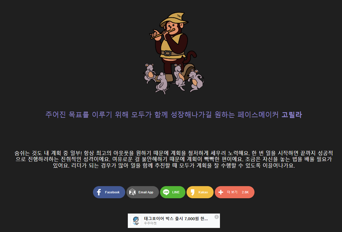 [결과화면]에서는 미리 자바스크립트 객체로 만들어 둔 결과지에 따라서 검사자에 맞는 동물을 찾아준다. 만약에 검사자가 ISTJ가 나왔을 경우에 "하마"이미지와 함께 특징에 대한 설명을 제공해준다.