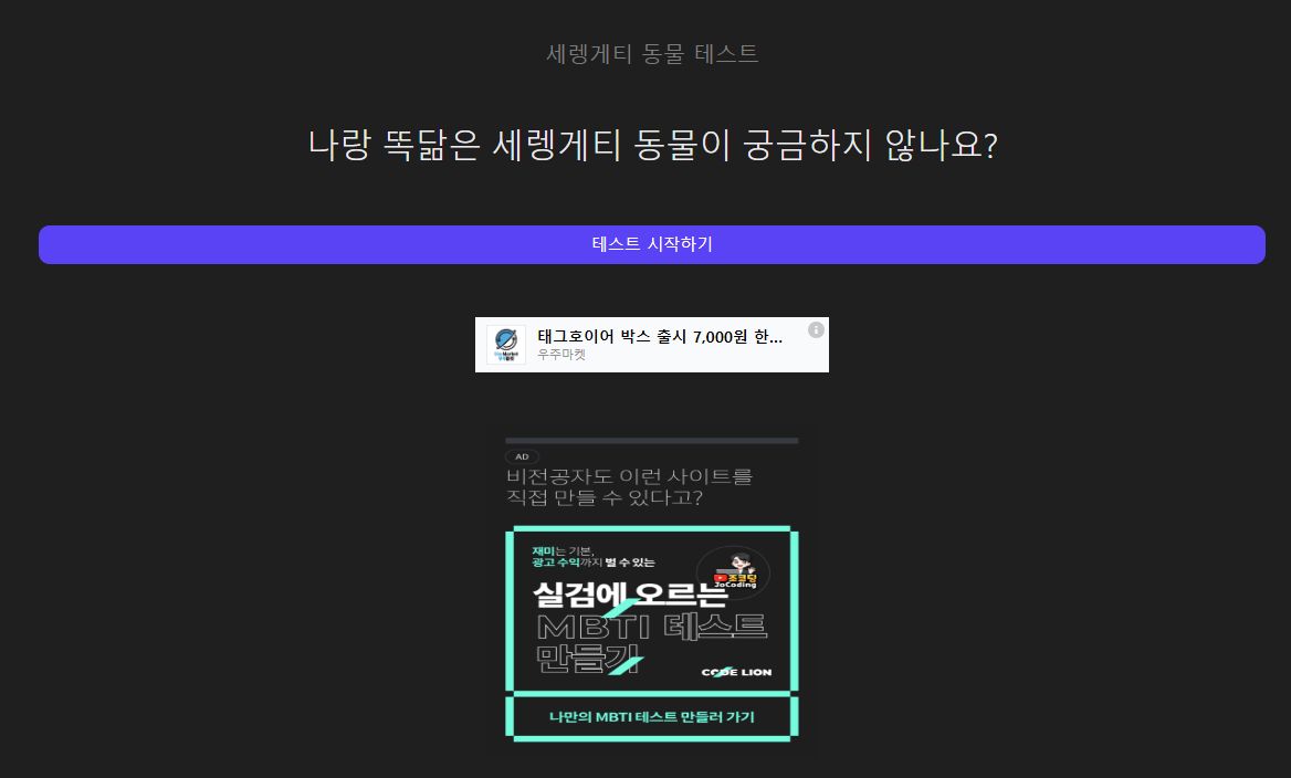 codelion강의를 들으면서 나와 닮은 세렝게티 동물을 알려주는 일종의 mbti테스트를 만들어 보았다.