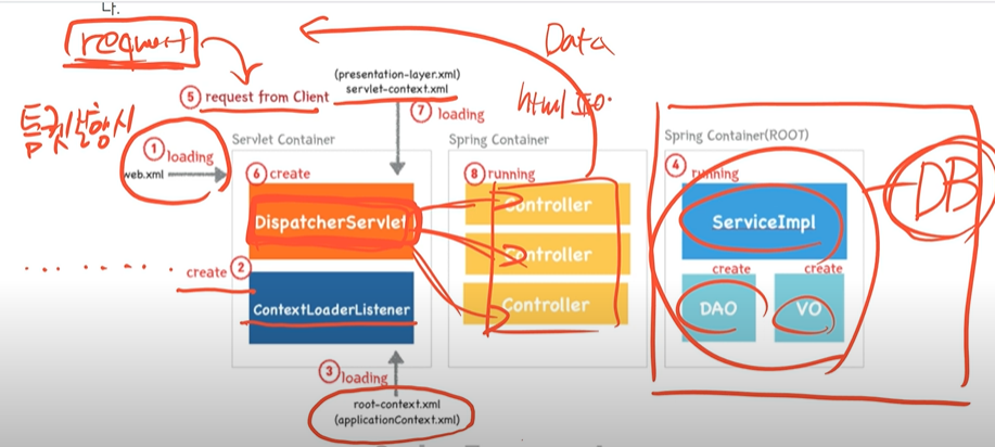 사용자의 요청이 들어오면 DispatcherServlet이 동작하여 컴포넌트 스캔을 통해서 자원들을 스캔하여 필요한 것들을 메모리에 올린다(IoC). 필요한 것들인지의 여부는 어노테이션으로 확인한다.