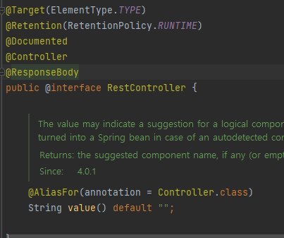 @Controller대신 @RestController를 사용하면, 해당 컨트롤러에 모두 @ResponseBody가 적용된다. 따라서 뷰 템플릿을 사용하는 것이 아닌, HTTP 메시지 바디에 직접 데이터를 입력하여 반환한다. 이름 그대로 Rest API를 만들 때 사용하는 컨트롤러이다. 실제로 RestController를 들어가보면 @Controller와 @ResponseBody가 적용된 모습을 볼 수 있다.