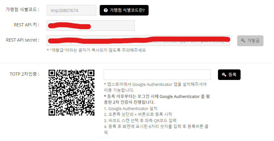 검증 Token을 받기 위해서 아임포트 관리자페이지[시스템설정]에 있는 REST API키와 REST API secret을 복사해준다.